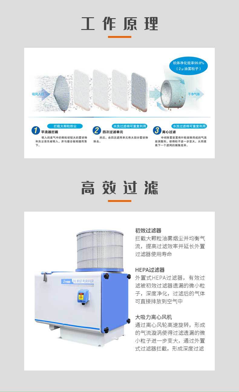 含油量气体从进气口吸进清洁房间内,历经第一级大气气溶胶分离设备后,保持汽液分离出来,一部分焊接烟尘将防护在凝集反应器上。当历经袋式油雾过滤器时,绝大多数焊接烟尘颗粒物被过滤,未被清洁的粒子在历经高效送风口时,被完全清洁。当焊接烟尘在过滤装置上长期性堆积,机器设备摩擦阻力扩大,当压力差做到预设值时,自动控制系统会全自动提示清除数据信号,有利于机器设备的清除和维护保养。